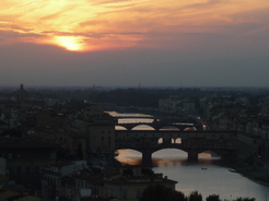 Pour notre dernière journée à Florence, nous passons de l'autre côté de l'Arno, avec comme étape principale le Palazzo Pitti (photo 132, vu de dos). Pour changer, pas mal de musées, et une détente bienvenue ensuite dans les très beaux jardins de Boboli (photo 131), où on croise de drôles de choses, notamment des sculptures contemporaines (photo 133), et d'autres d'époque mais néanmoins curieuses (la fontaine au gros tout nu, photo 134), sans parler de la très kitsch grotte artificielle (photo 135). Et puis l'un des intérêts de passer le fleuve, c'est de monter vers l'église de San Miniato (photo 137) pour avoir une vue imprenable sur la ville (photo 138). D'ailleurs, on y est restés jusqu'au coucher du soleil, qui a un peu eu le mauvais goût de se planquer derrière les nuages (photo 141), mais qui réserve quand même quelques belles vues sur l'Arno (photo 142). Et pour finir, un dernier coup d'oeil au Duomo, qui est quand même la plus belle perle de Florence, qui en comporte pourtant un sacré lot (photo 140).