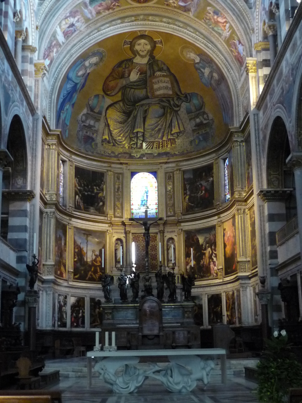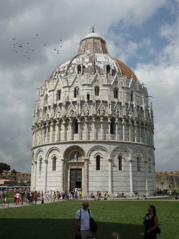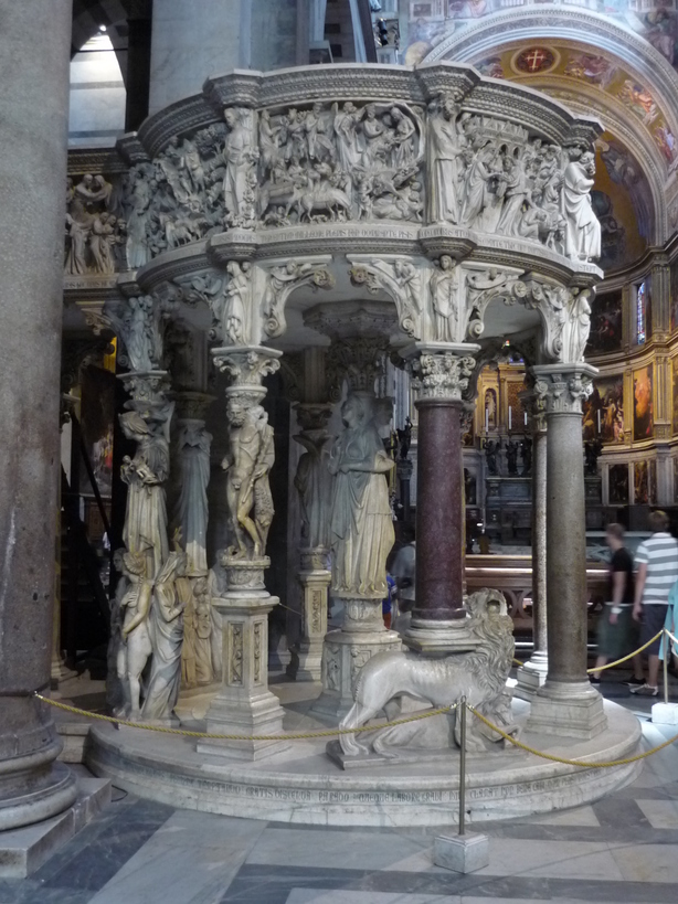Première excursion depuis Florence, un classique du tourisme, la bonne ville de Pise, où se trouve la tour (photo 147), mais pas seulement. La ville elle-même est loin d'être moche, et sur la place des miracles, outre la tour, on trouve un cimetière fort charmant (photo 148), un baptistère qui vaut le coup d'oeil (photo 146), et surtout une superbe cathédrale (photo 149). Pour une fois, vous aurez même droit à des photos d'interieur (photo 150), avec notamment un plafond surprenant (photo 152), et une chaire sculptée magnifique (photo 151). Bon, de toute façon, cette tour, si elle n'était pas penchée (photo 147), en parlerait-on autant ? Allez, on va l'aider en lui donnant une petite poussette (photo 145). Et après un petit tour devant l'ahurissant alignement de boutiques de souvenirs (qui vendent toutes les mêmes horreurs à des prix délirants), une dernière vue de la place (photo 153). Oh, et puis j'allais oublier LE monument à ne pas rater à Pise, c'est bien entendu l'ENS (photo 143). Eh oui, ils ont des Ecoles Normales Supérieures aussi, en Italie.