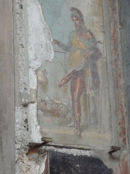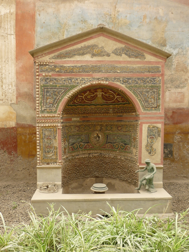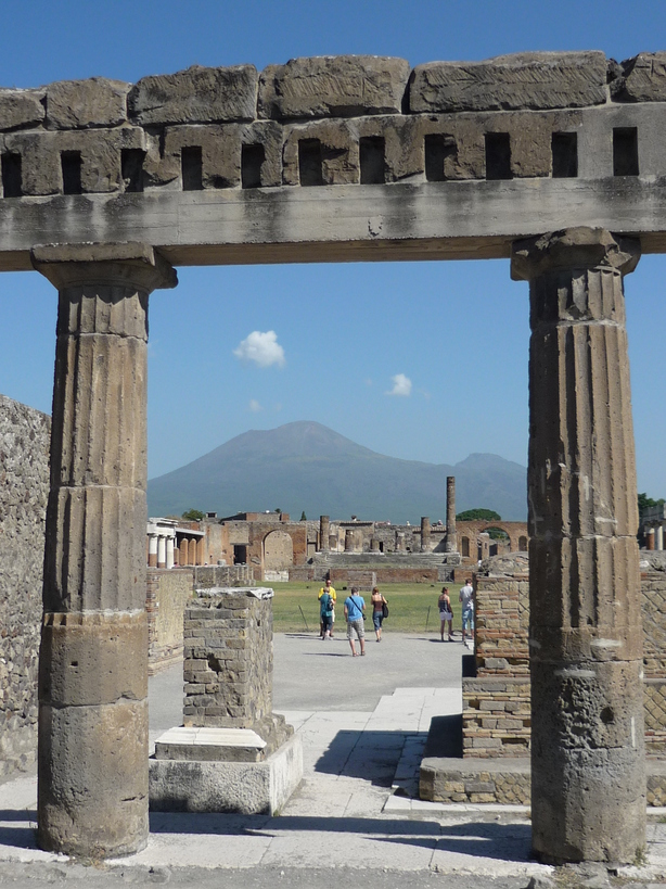Toujours à Pompei, nous avons croisé plein de trucs rigolos : des thermes très bien conservés (photo 019, ça donnerait presque envie de se baigner, mais il manque tout de même un élément essentiel : l'eau) ; un faune qui continue à garder l'entrée de sa maison depuis plus de 2000 ans (photo 020, même si c'est pas l'original) ; plein de mosaiques partout parce que les romains aimaient ça (photo 024) ; des rues avec des maisons partout autour (un truc de dingue, photo 025) ; un amphithéâtre (même quon pouvait rentrer dedans, photo 022) ; une palestre (photo 027, prise à travers un trou dans le mur parce qu'elle on ne pouvait pas rentrer, d'où l'absence surprenante de touriste sur la photo) ; des fresques avec des dames toutes nues dessus (photo 023) ; des fresques avec un monsieur pas tout nu mais qui montre quand même une belle anatomie (photo 026, c'est l'entrée du lupanar, ce qui peut expliquer des choses) ; le plus vieux "attention au chien" connu (photo 028) ; et on a même croisé Herculanum (photo 030) mais ça, admettons-le, c'était après avoir refait un peu de trajet en train.