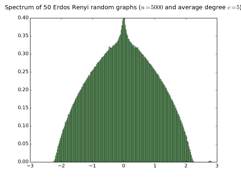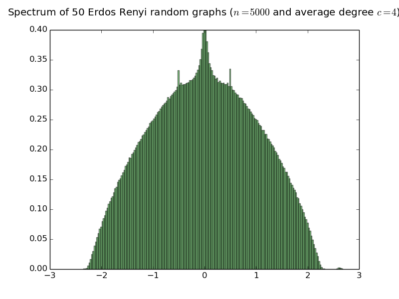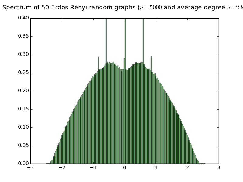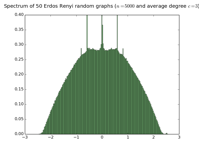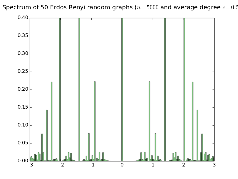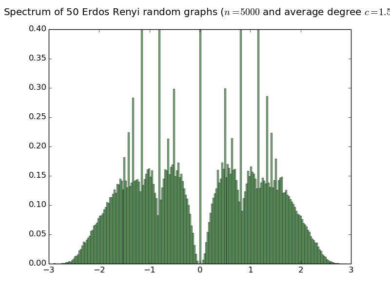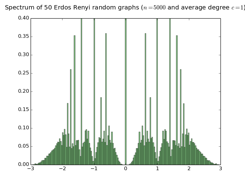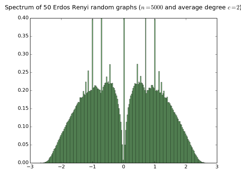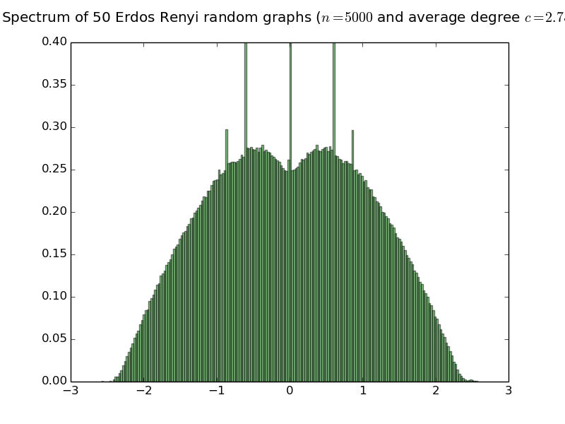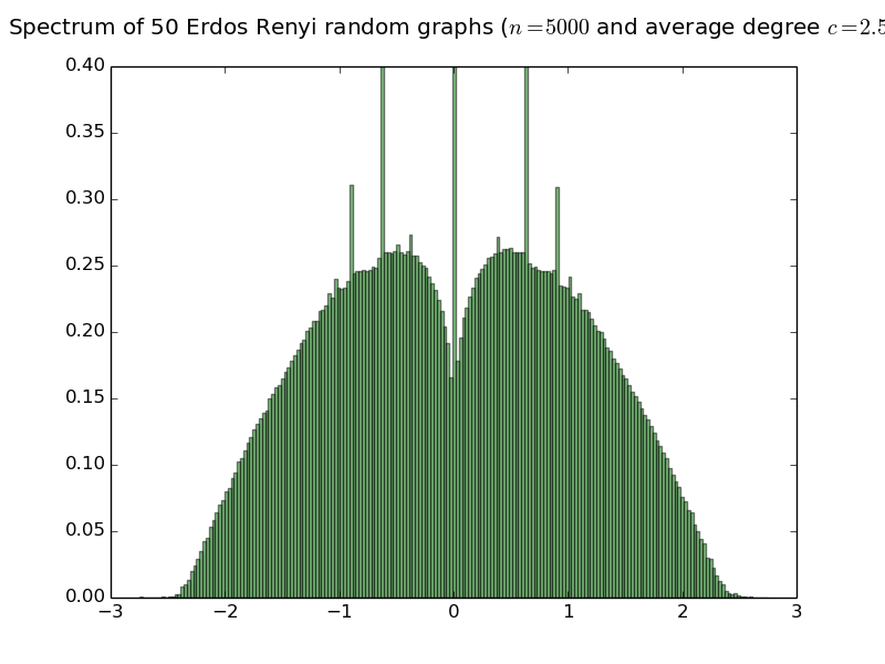 Below are histograms of the empirical spectral distribution of adjacency matrices of Erdös-Rényi random graphs with various average degree. The limit law is purely atomic iff the average degree is smaller than or equal to 1 (see the work of Bordenave Sen and Virag). Simulations are done with 50 matrices of size 5000.