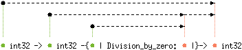 val div : 'a int32 -> 'b int32 -{'c | Division_by_zero: 'c |}-> 'a int32