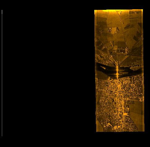 click here to see a 166kB film showing it (if it fails try this link, beware, this is an oddly shaped film 914×276 you might have to disable "aspect ratio" function of your visualiser application, I also suggest to set the "original size" option)Most often, the above described synthetic antenna is used in the strip-map (also called push-broom) mode. Schematically, suppose that we stop the synthetic antenna scanning when it is in the middle of the illuminated area, we would obtain a single line image. But we can the slowly shift the time interval of signal used for synthesis along the whole trajectory (while keeping the steering in the same direction). Visually imagine that the little grey dash on the image slowly drift along the flightpath, this produces an image as this one: