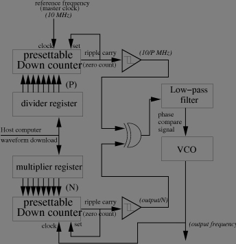 and the arbitrary wave generator (AWG) produces the linear frequency ramp (chirp) needed for pulse synthesis. An AWG is basically a counter addressing a random access memory containing the sampled numerical values of the signal and a digital to analog converter.