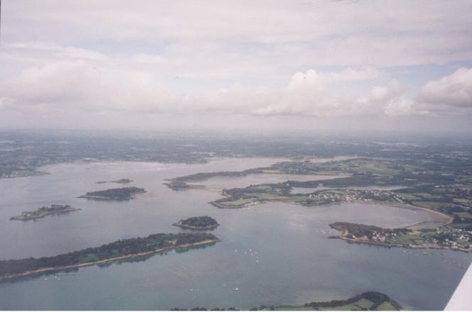 F-GMHH (Hotel-deux fois): An interesting Robin HR100 with extended range capability (could fly 6 hours on a single tank, but the flight instructor didn't have the same autonomy, I had to perform an emergency procedure known as PPI - for "Pause Pipi Instructeur" :-o) and variable pitch propeller. It only lacked retractable gears, but she died so young... a few steps away from the runway... life is a bitch ;-( I didn't event took a picture of her, you can see a few square centimeters of its right wing above the Morbihan Gulf (France). |
