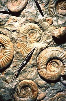Ces deux types de Céphalopodes sont abondants dans les mers jurassiques, comme en atteste ce calcaire Jurassique supérieur (160 Ma). En noir, les rostres de Bélemnites, partie terminale de la coquille interne de l'animal (homologue de "l'os" de la seiche ou de la "plume" du calmar actuel). Image : National échelle 1/2 |