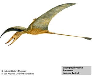 Ils sont présents dès la fin du Trias avec un premier groupe, les Rhamphorhynchoidés, dont les représentants sont de petite taille, mais déjà parfaitement capables d'un vol battu, et possèdent une queue, qui faisait probablement office de gouvernail. On les rencontre encore au Jurassique, avec des formes comme Dimorphodon (Jurassique ancien), Pterodactylus, ou Rhamphorhynchus (Jurassique récent, ci-contre). Ils s'éteignent à la fin du Jurassique. |