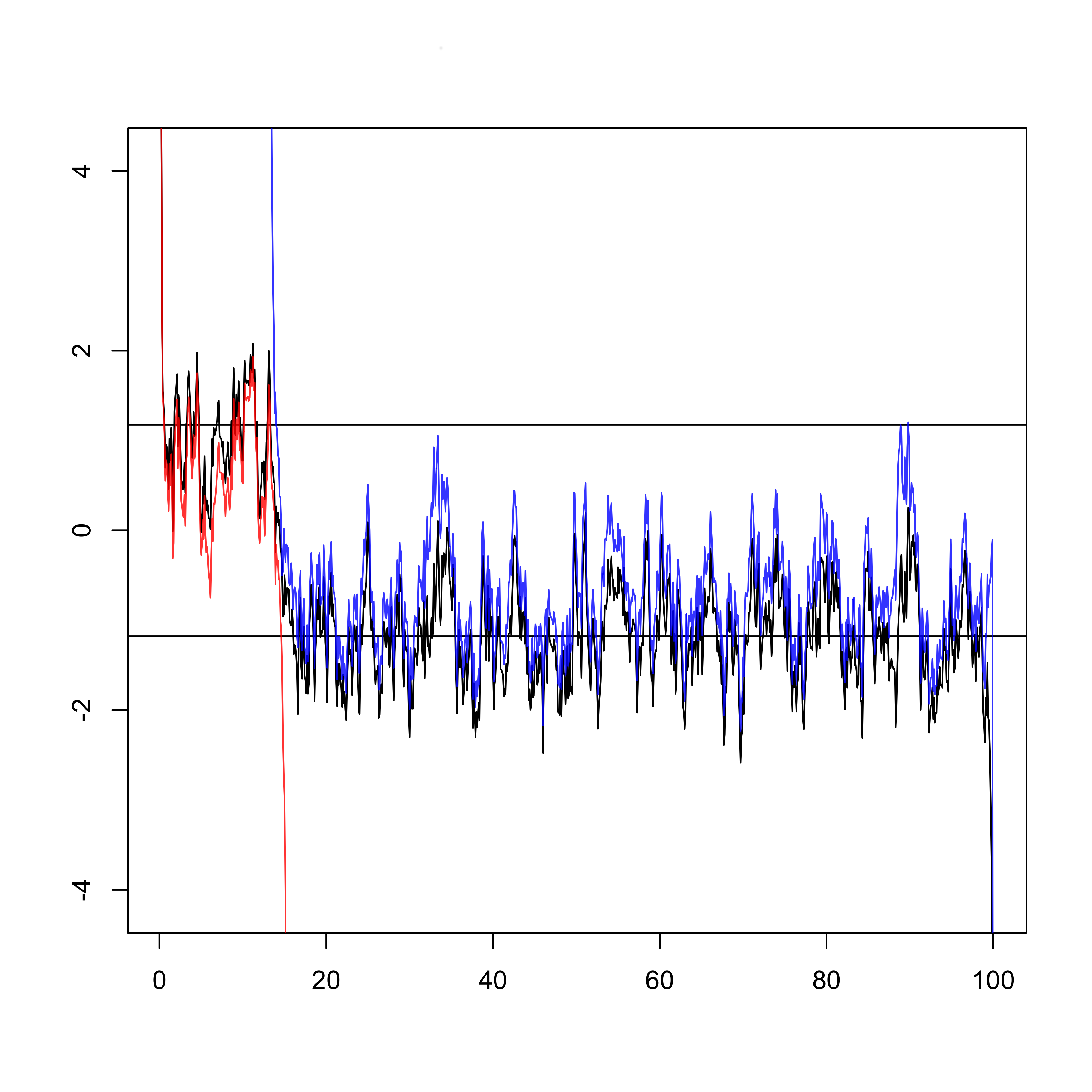 Riccati transform f'/f (in black) of the first eigenvector f of the Schrödinger operator -d^2/dt^2 + B' (where B' is the white noise) and its approximation by diffusions (in blue and red). This eigenvector is localized around the explosions of the diffusions and growths/decays exponentially about this point.