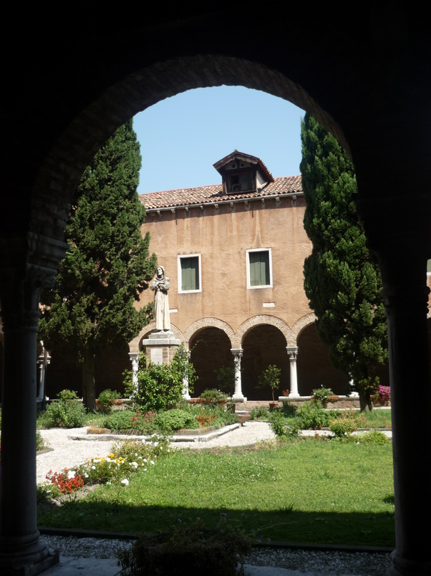De la basilique Saint-Marc, sur laquelle j'ai été si sévère un peu plus haut, on admirera tout de même les mosaiques dorées (photo 175). Parmi les curiosités croisées dans nos visites autour de la place, notons ce lustre en verre de Murano (photo 184), on veut bien le même à la maison. De la place, on a également une belle vue sur l'église San Giorgio Maggiore (photo 183), plantée sur une île déserte (on se demande bien à quoi ça sert, mais bon). Sinon, on a encore vu des gondoles (photo 185), des églises (photos 186, 188 et 196) avec même un joli cloitre dans l'une d'elles (photo 190, c'est dans l'absurdement riche église de Santa Maria dei Frari). Etonnant, non ? Plus original, l'arsenal de Venise (photo 189) ne manque sûrement pas d'intérêt, mais je ne saurais vous le dire puisqu'on ne peut pas y entrer (c'est toujours une zone militaire). On a quand même eu droit à une visite d'un musée naval assez rigolo (plein de bateaux).
