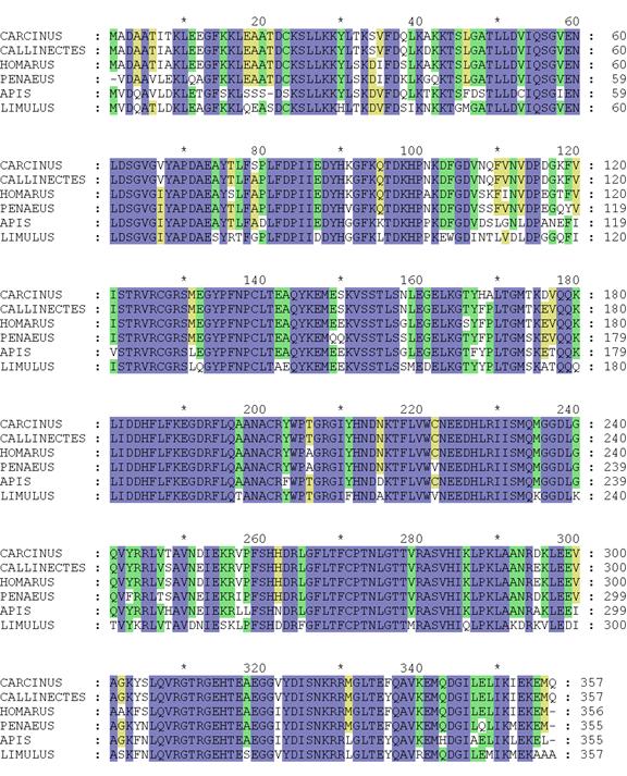 Here is an alignment from the two arginine kinase sequences listed above plus four others:
