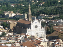 Pas de photos des musées, donc, mais tout de même quelques autres choses à voir à Florence. Le Palazzo Vecchio (photo 126), vous l'avez déjà vu, mais voila son copain le Ponte Vecchio (ils ont que des vieux trucs à Florence), photo 121, le seul vieux pont de la ville à avoir survécu à la deuxième guerre mondiale. Et tant qu'on y est ajoutons une petite vue de l'Arno (photo 129), le fleuve qui traverse tranquillement Florence. Mais le gros morceau en dehors des musées, c'est Santa Croce (photo 122, je ne sais plus si c'est une basilique ou autre chose, c'est compliqué la classification des églises), où on retrouve une statue de Dante (photo 123), mais surtout les tombeaux de nombre de célebrités locales, comme Galilée (photo 127). Et puis bon, même sans ça c'est beau (photo 128). D'ailleurs, vous aurez même droit à une photo vue du ciel (photo 124) pour admirer l'apposition d'une façade Renaissance sur une église beaucoup plus ancienne. Quand je dis vue du ciel, c'est depuis rien moins que la coupole de Brunelleschi, où nous sommes montés (et redescendus, même si ça n'a pas été facile pour tout le monde). L'occasion également d'admirer une belle vue du campanile de Giotto (photo 125). Tout ça mérite un bon dîner dans notre resto florentin préféré, mais pour ça, vous n'aurez pas de photo (mais vous pouvez toujours noter le nom, ça s'appelle Il gatto e la volpe, soit en français le chat et le renard, clairement un resto fait pour moi). Je vous livre juste en complément nos duettistes en stars, parce qu'ils le valent bien (photos 130 et 136).