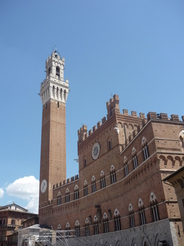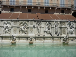 Notre deuxième excursion hors de Florence sera pour visiter la ville médiévale de Sienne. Ben en fait de médiéval, ce qu'on voit en arrivant, ce sont des églises (photos 154 et 155), ça ne nous change pas vraiment ! Non, je charrie, c'est effectivement une petite ville assez typique avec ses vieilles petites rues qui débouchent sur cette drôle de place en forme de coquille Saint-Jacques, le Campo (photos 157 et 165). On y admire notamment la fontaine Gaia (photo 156, en vrai elle est pas très grande, mais jolie quand même) et comme un peu partout dans le coin, un campanile qui domine le tout (photos 158, 161 et 162). On peut aussi se demander qui, du Roupoil (photo 159) ou du hibou (photo 160, ils font des démonstrations de rapaces), est le plus impressionnant (j'ai bien mon avis, mais je vous laisse juge quand même). Bon, et à part ça, il y a, à Sienne comme ailleurs, une cathédrale qui vaut le coup d'oeil même si elle est en travaux (photo 163), notamment parce qu'elle renferme en son sein la petite salle de la bibliothèque Piccollomini et ses très belles fresques (photo 164), et l'imposante basilique Saint-Dominique (photo 166), qui vaut surtout pour sa vue sur l'ensemble de la ville.