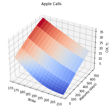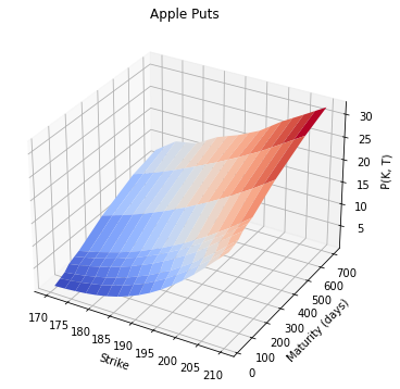Let’s plot put options surface for the given AAPL data. We use linear interpolation for missing strikes.